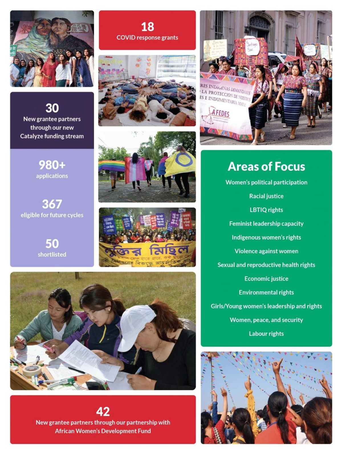 Earlier this year, we provided grants through our first global feminist funding stream: Catalyze. We invited a wide array of women’s rights and feminist organizations actively working to address the gendered impacts of COVID-19 to apply. The response was immense—yielding over 980 applications from organizations around the world. Working in Africa, Asia, the Pacific, Latin America, Eastern Europe, and the Middle East, these 72 fearless feminist organizations are forging lasting change globally. Together, they are calling out gender inequality wherever they see it and tearing up old rulebooks along the way. Their fierce leadership is advancing anti-racist, anti-colonial, and intersectional agendas, responding to rights crackdowns, addressing violence at multiple levels, and promoting economic justice.