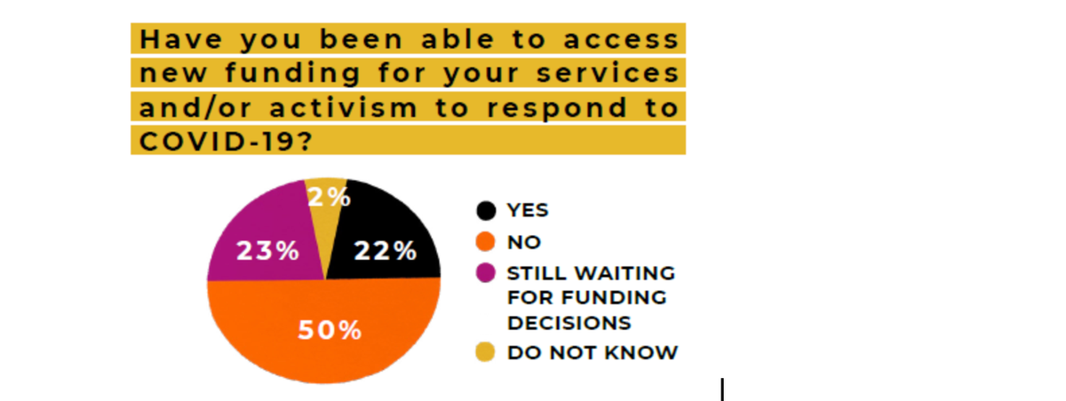 The report documents the funding challenges experienced by organizations. While some funders took steps in the early stages of the pandemic to reduce the burden on grantees, overall the majority of organizations participating in the survey reported that they have not received any additional funding to support their COVID-19 response. They also reported having grants reduced or cancelled. This mirrors a survey done by the Women’s Peace and Humanitarian Fund in early 2021 of their grantees. Eighty-four percent of respondents felt that their organization’s existence was at risk due to lack of funding.