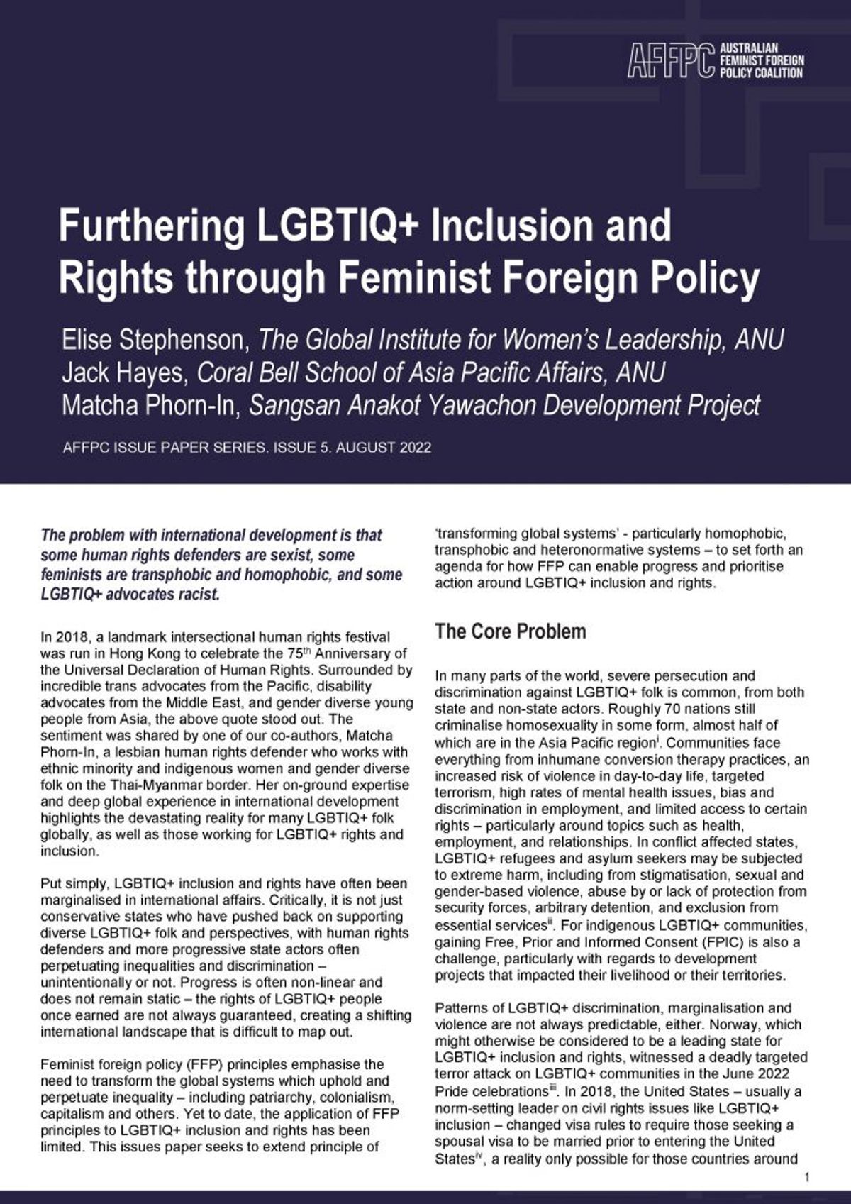Furthering LGBTIQ+ Inclusion and Rights through Feminist Foreign Policy. Elise Stephenson (the Global Institute for Women’s Leaders, ANU), Jack Hayes (Coral Bell School of Asia Pacific Affairs) and Matcha Phom-In (Sangsan Anakot Yawachon Development Project). Australian Feminist Foreign Policy Coalition, (August 2022)