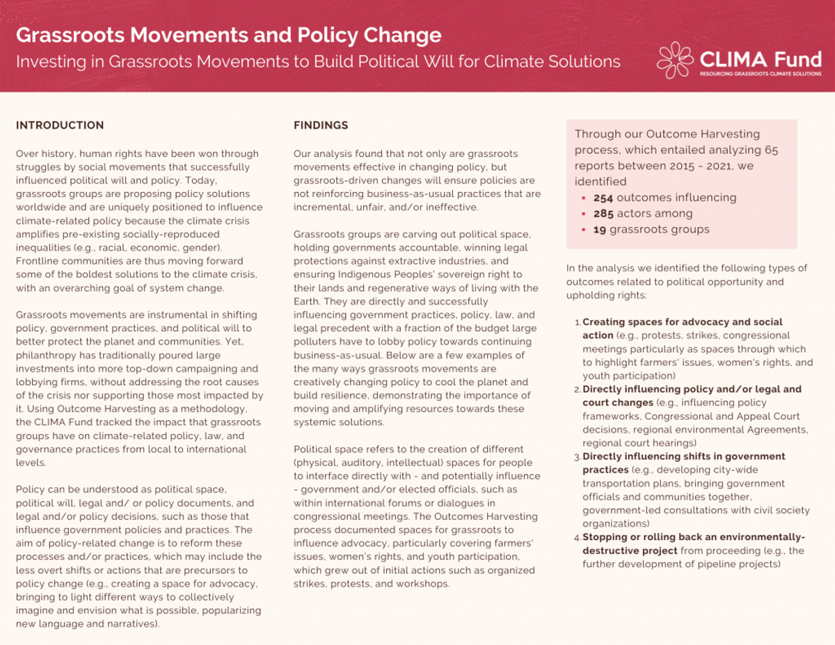 The Clima Fund asserts that “Frontline communities are moving forward some of the boldest solutions to the climate crisis, with an overarching goal of system change.” It explains how in two 2022 briefs, Grassroots Movements and Policy Change and Grassroots Movements and Systemic Change. Clima used outcome harvesting to track the 2015-2019 impact of 19 grassroots partners on climate-related policy, law, and governance practices.