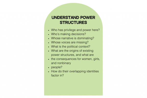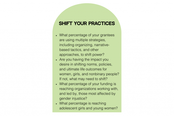 Lighting the Way includes broad recommendations for funders: Understand power structures; Re-examine risk; Fund feminist funds; Shift your practices; and Measure what matters. Two recommendations feature helpful questions donors should ask themselves: