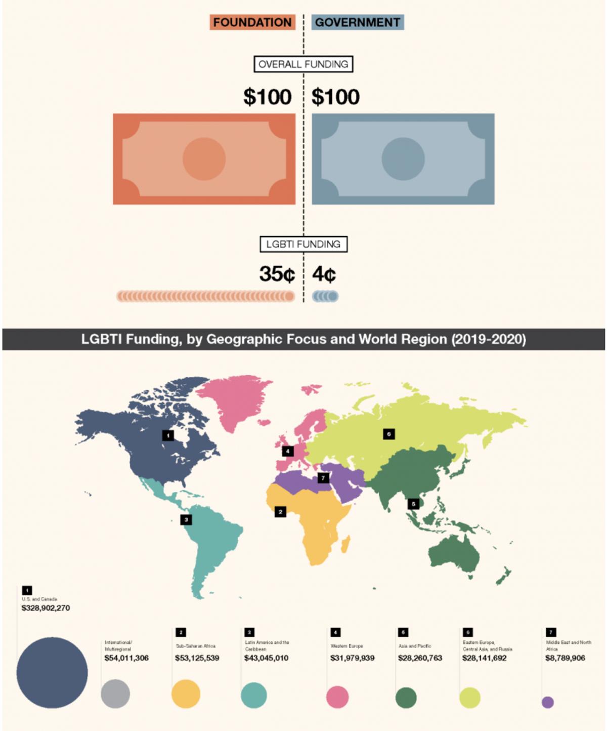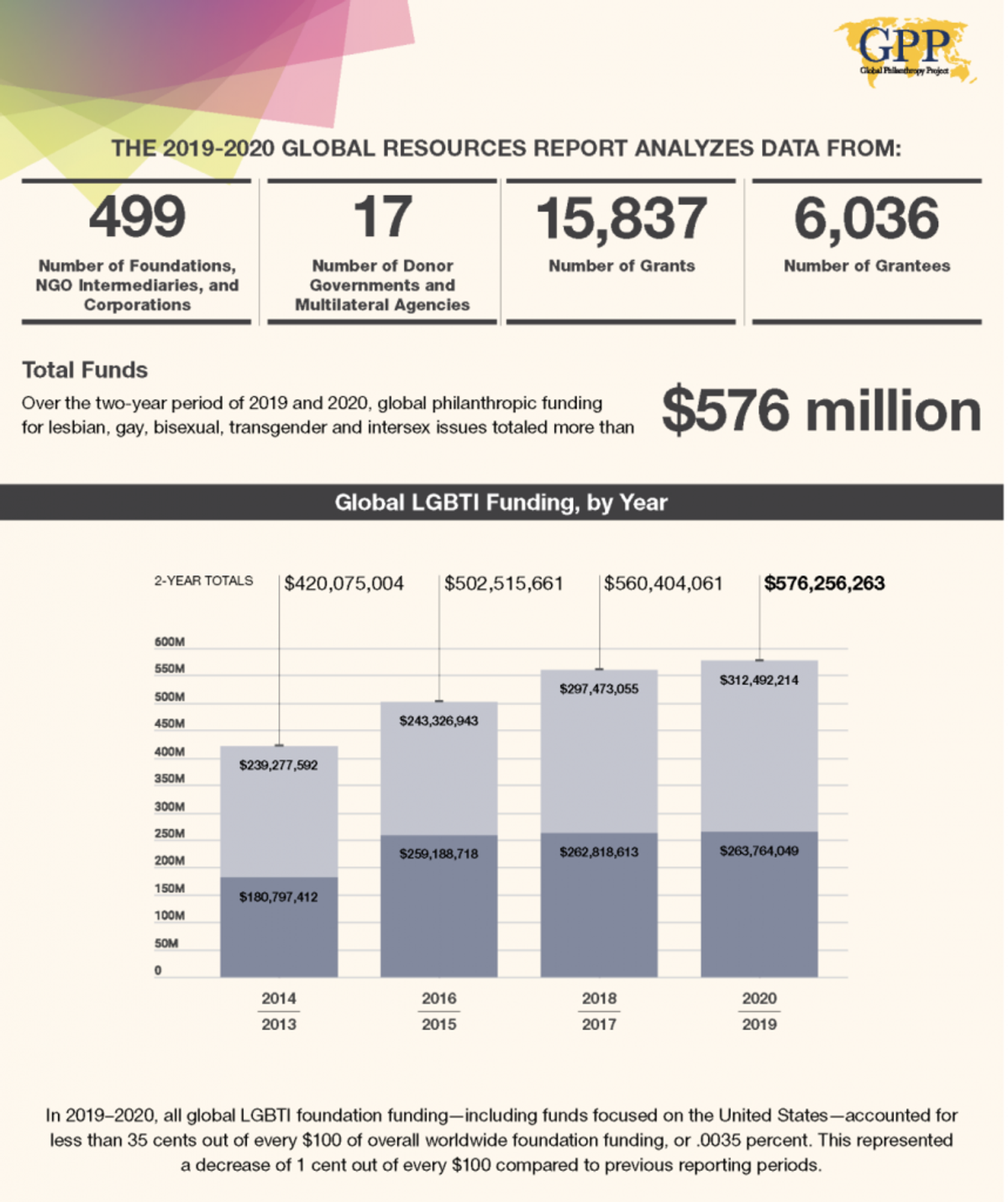 The report analyzed 15,800 LGBTI grants totalling $576 million awarded to 6,000 grantees over a two-year period (2019 and 2020). These grants came from 499 foundations, intermediary NGOs, and corporations and 17 donor government and multilateral agencies.