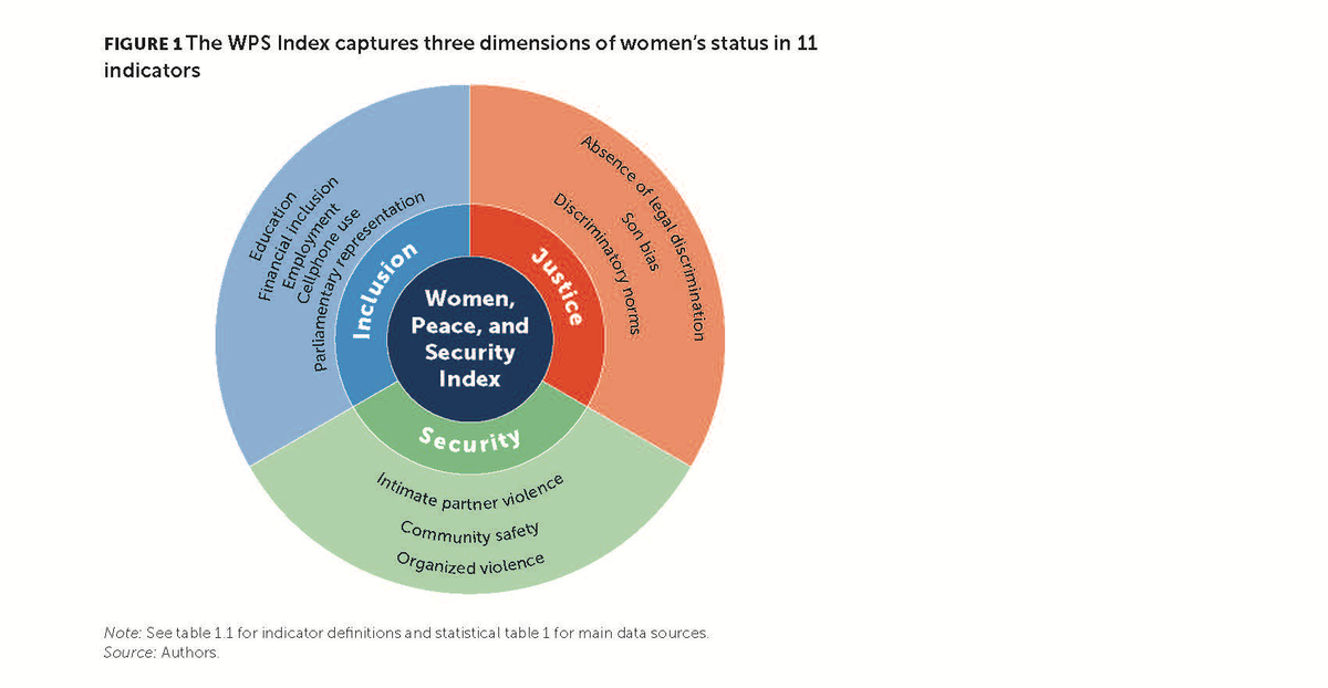 The Index includes three dimensions: women’s inclusion (economic, social, political), justice (formal laws and informal discrimination), and security (individual, community and society), using 11 indicators.
