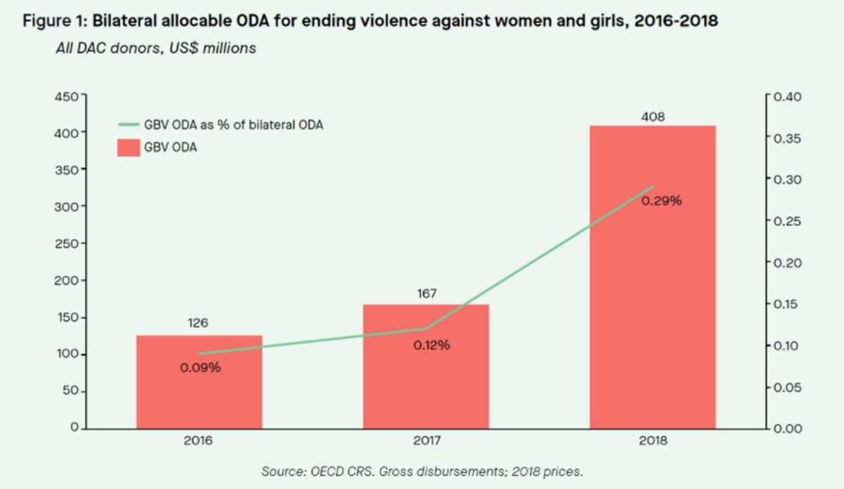 Drawing on the OECD-DAC’s gender equality marker data, the authors outline how funding going to SGBV from bilateral development organizations has increased (more than tripling between 2016 and 2018), primarily due to the Spotlight Initiative. This initiative is a multiyear partnership between the European Union and the United Nations with an initial commitment of €500 million.